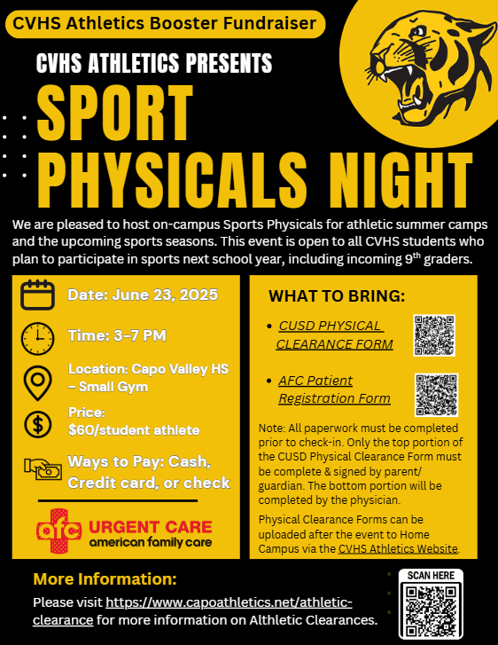 We’re excited to invite all student-athletes to our CVHS Sports Physicals Night, hosted on campus as part of our Athletics Booster Fundraiser. This is a great opportunity for students to complete their sports physicals ahead of summer camps and the 2025-26 athletic seasons.